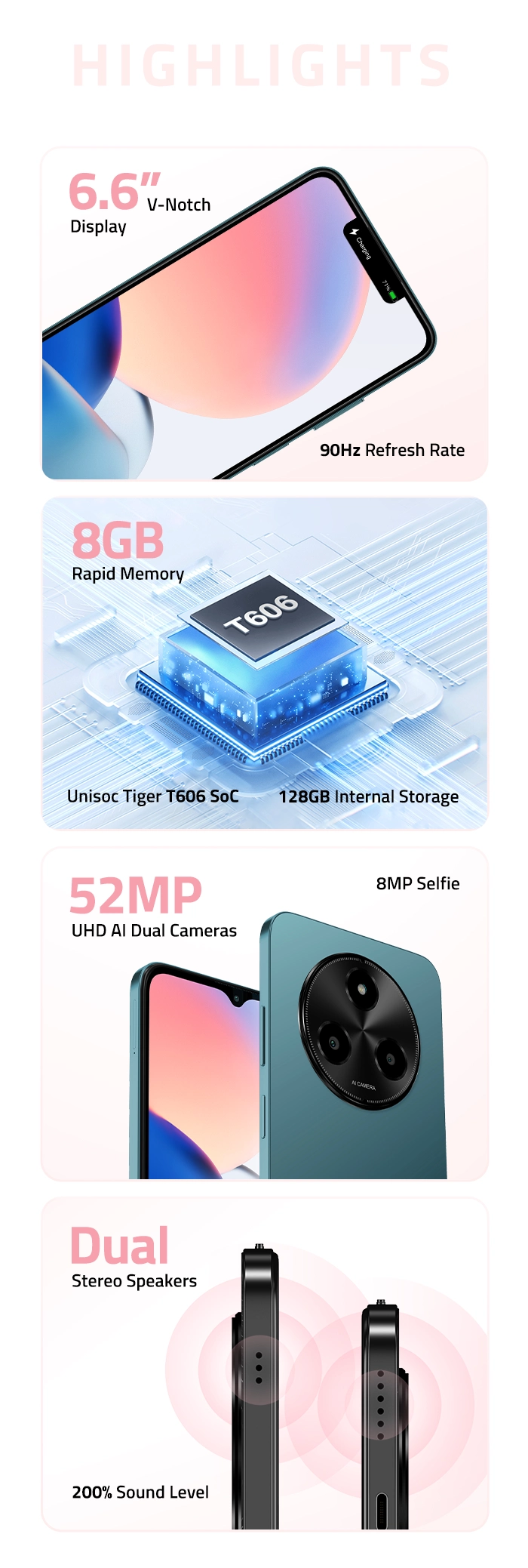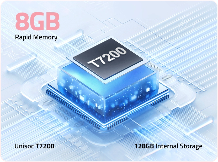 The Unisoc Tiger T606 SoC brings unstoppable speed and energy efficiency, perfect for multitasking, gaming and streaming all day long. With 8GB Rapid Memory and 64GB storage, multitask seamlessly and keep your world at your fingertips, ready for every snap, stream and scroll