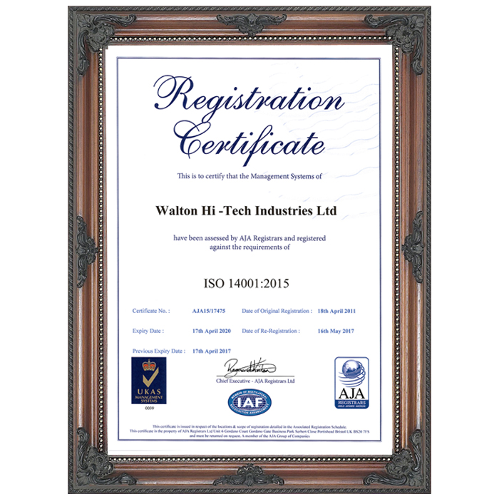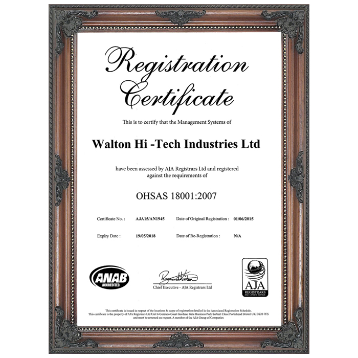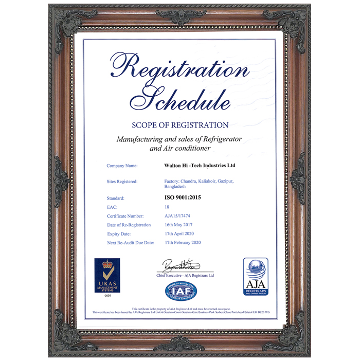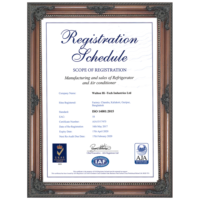 Walton has been maintaining 100% compliances since its inception and certified ISO 14001:2004 Refrigerators & Air Conditioner Division, ISO 9001:2015 Refrigerators & Air Conditioner Division and OHSAS 18001:2007 Certificate for successfully adopting sound occupational health and safety management systems, efficient staff management, minimizing the risk of accidents and achieving adequate corporate reputation ensuring the standard of products and combining the above to minimize the production cost.