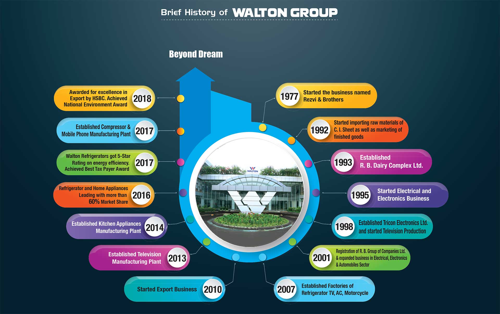 Along the way, Walton has earned domestic and global recognition for its experience and proven track record in a variety of electronics fields. Walton is the pioneer of developing state of the art designs and modern technology having leading market share specializing in Multi-Stored Refrigerators, Freezers, Air Conditioners, LED/ LCD televisions, Motorcycles, Smart Phones and Home Appliances.Walton is working on carrying the flag of red and green into the global market presence from the present 40 countries to more than 200 countries to dominate Go Global and the top five Electronics Brand of the Globe within 2030.